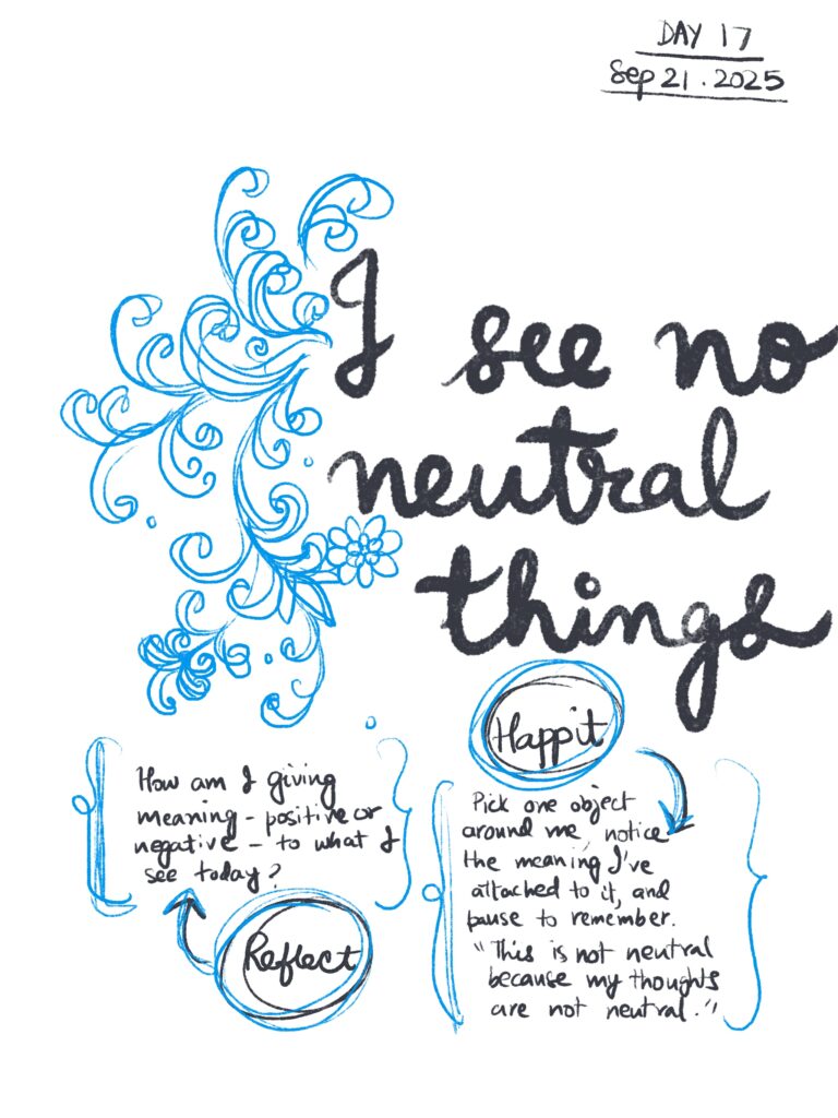 - Happit: Pick one object around me, notice the meaning I’ve attached to it, and pause to remember: “This is not neutral because my thoughts are not neutral.”