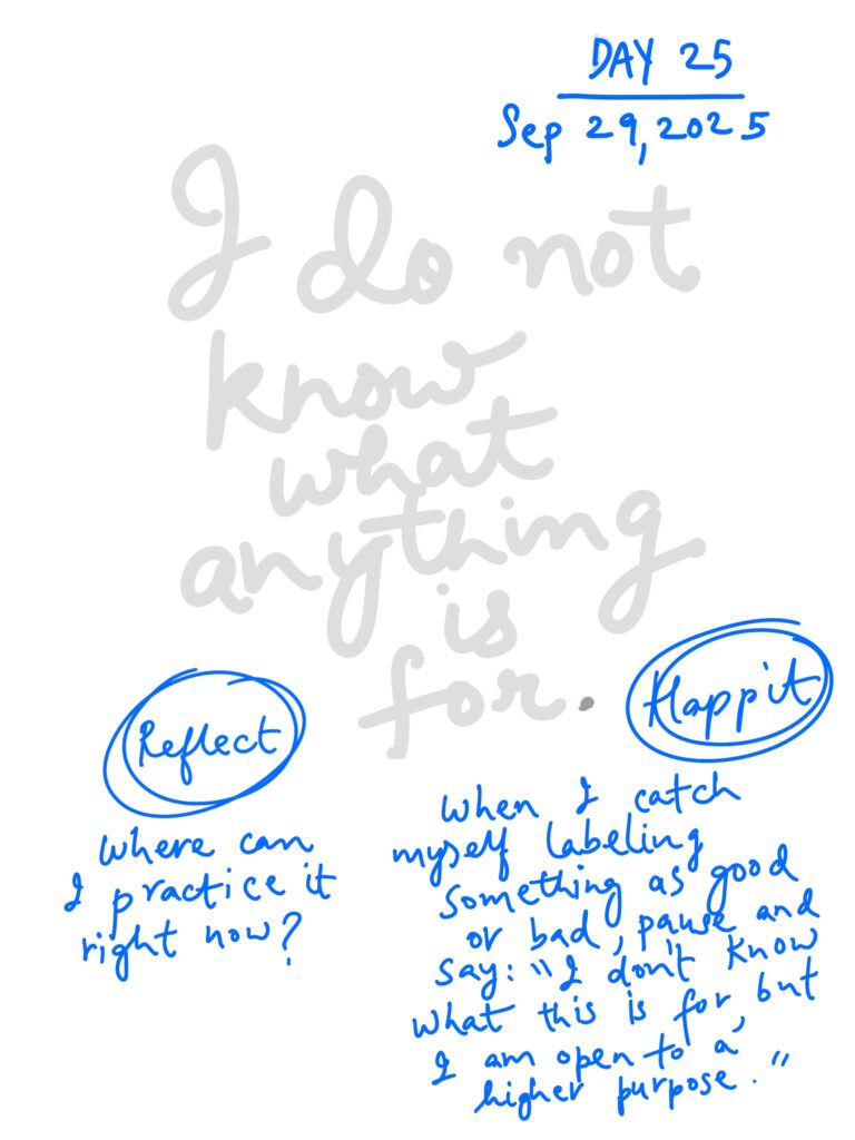 Reflect: Where can I practice it right now? Happit: When I catch myself labeling something as good or bad, pause and say: “I don’t know what this is for, but I am open to a higher purpose.”